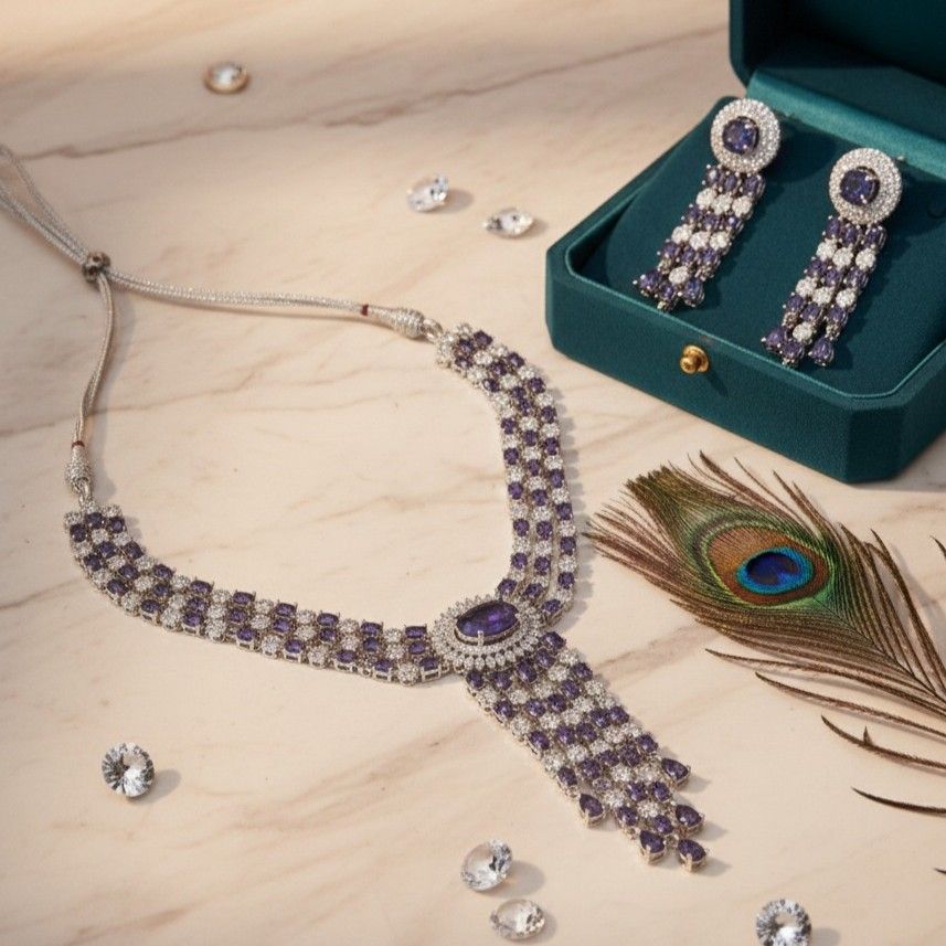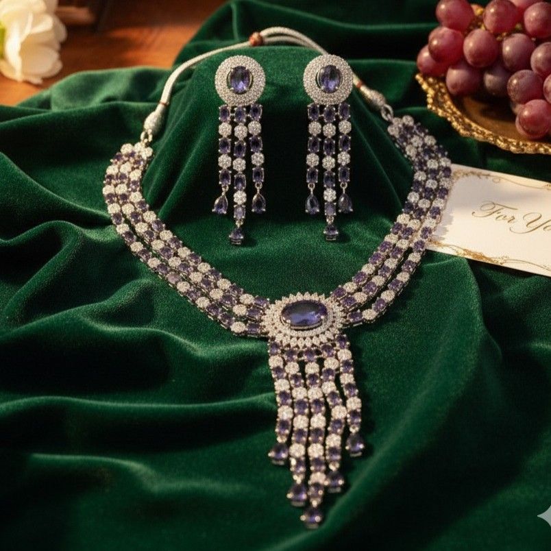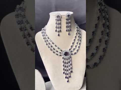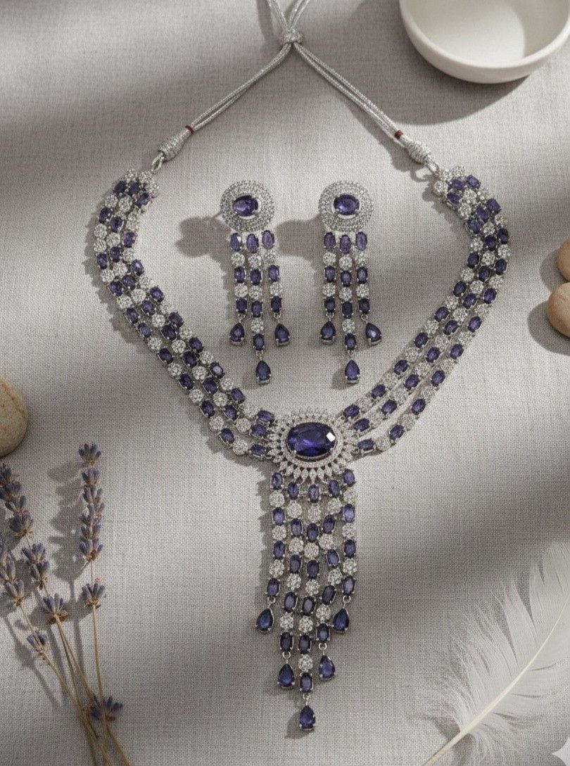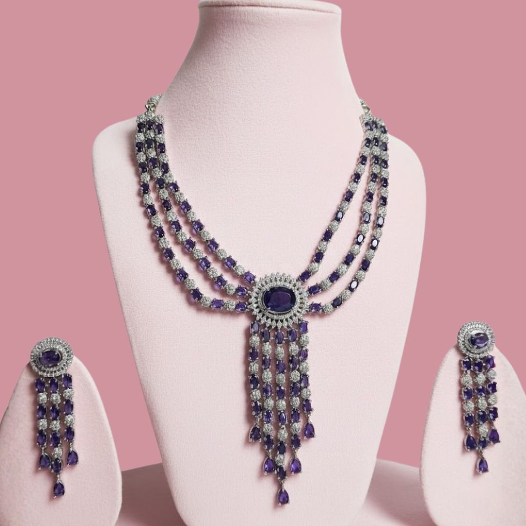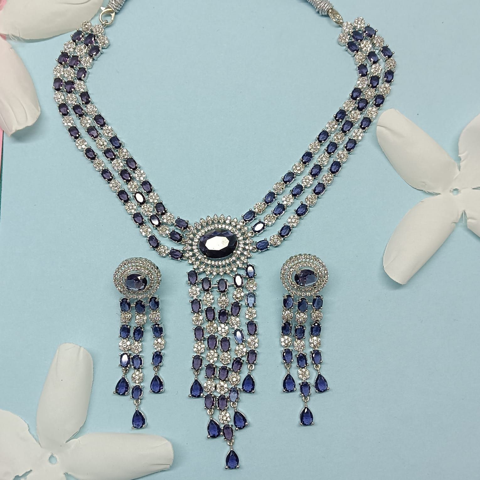 Make a stunning entrance with this luxurious sapphire-blue statement necklace set, crafted for the woman who loves elegance with a bold touch. This premium piece features three beautifully aligned layers of shimmering stones, each strand designed to highlight the neckline with flawless symmetry. At the center rests a striking oval blue stone, framed in radiant crystals and completed with dramatic cascading drops that add movement, grace, and undeniable glamour. The matching earrings mirror the same sophisticated charm, creating a cohesive look perfect for weddings, cocktail parties, receptions, sangeet nights, and upscale celebrations. With its rich color palette and refined detailing, this necklace set effortlessly blends modern glamour with timeless sophistication, making it an unforgettable statement piece for any special occasion.