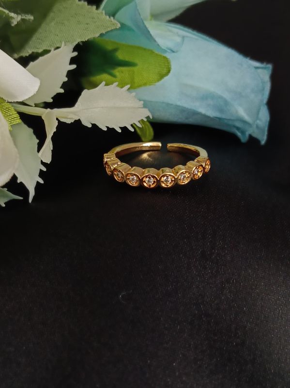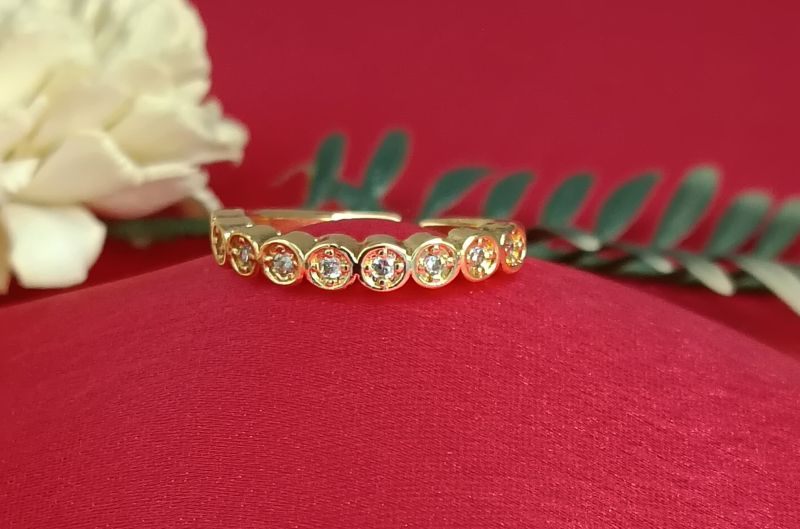 Add a touch of effortless elegance to your everyday style with this beautifully crafted open-band ring. Designed in a radiant gold-tone finish, this ring showcases a charming row of round, textured elements that add just the right amount of detail and shine. Each circular accent feels intentional—simple yet full of character.