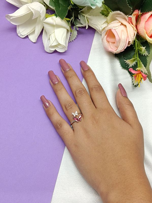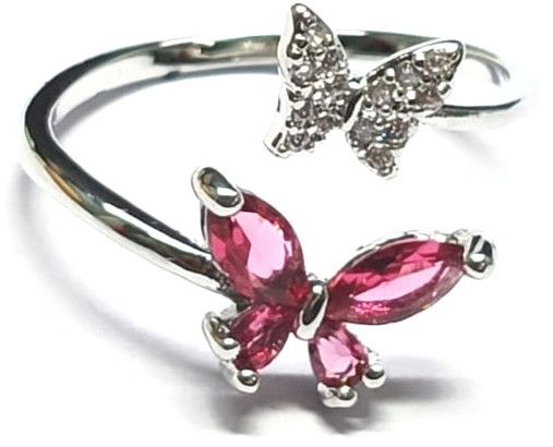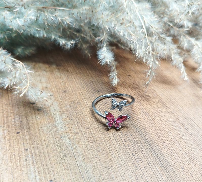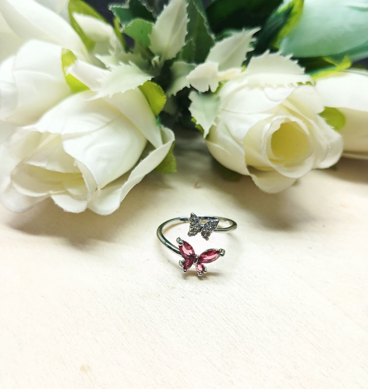 Celebrate grace, love, and transformation with this elegant butterfly ring, thoughtfully designed to add a feminine touch to your jewelry collection. The ring features a silver-plated alloy band and a beautifully detailed butterfly motif. One wing sparkles with tiny clear glass stones, while the other glows with soft pink gemstone-like accents—symbolizing love, renewal, and gentle strength.