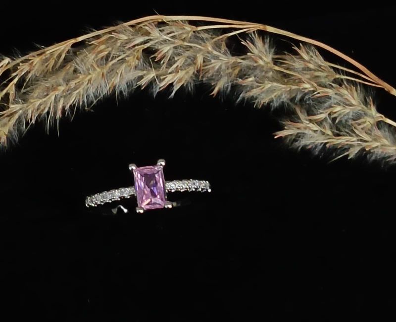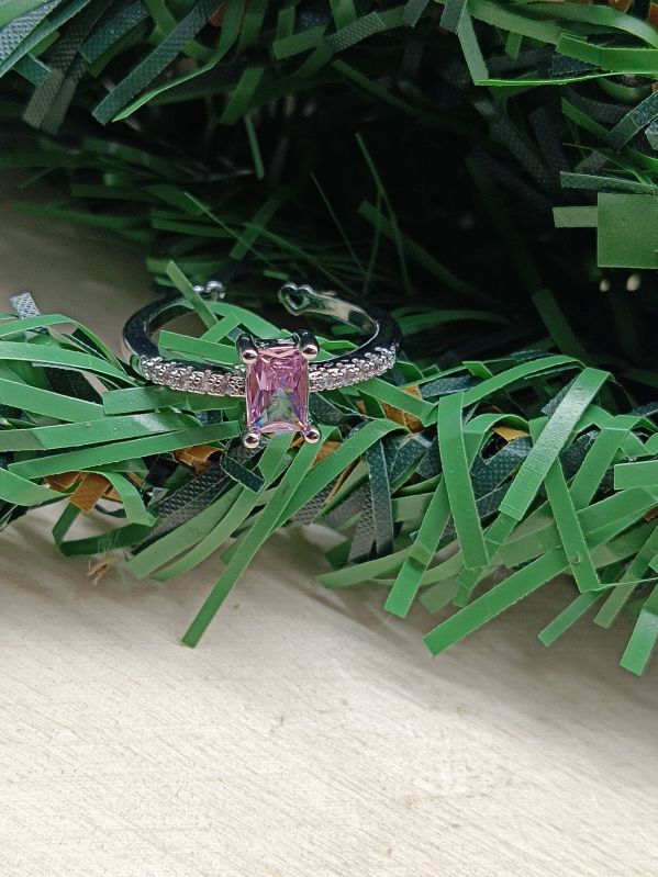 The ring highlights a rectangular light pink stone that offers a gentle pop of color, perfect for any occasion. Sparkling rhinestones along the band add a touch of glamour, making it an easy match for both casual and dressy outfits. Its open design ensures a flexible fit for most finger sizes.