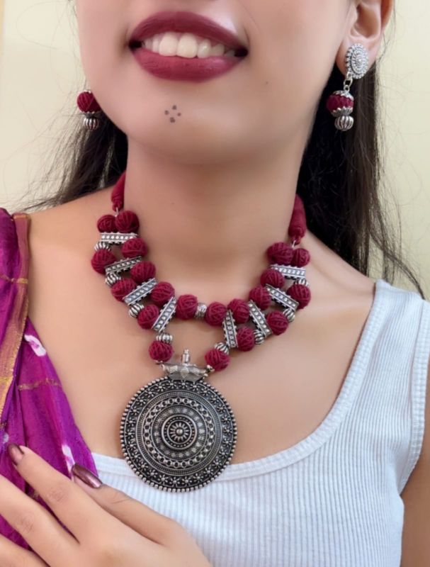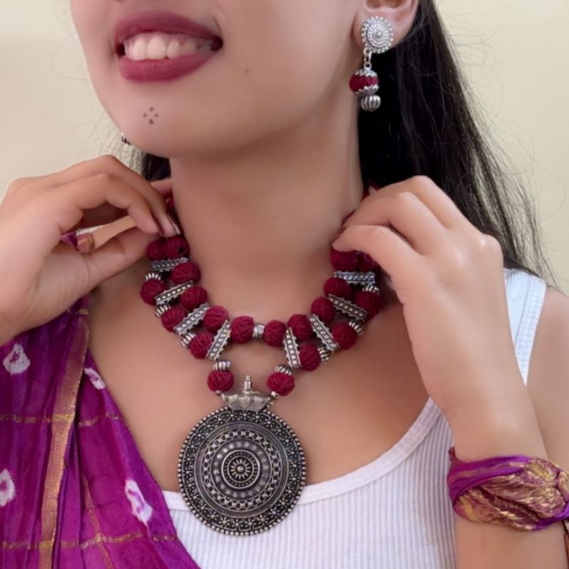 Elevate your style with this handcrafted necklace set, featuring a detailed round centerpiece paired with textured metal beads in a classic oxidized finish. The design is enhanced with soft maroon thread accents, offering a subtle blend of color and character. A comfortable, adjustable tie closure ensures the necklace sits perfectly, whether worn loosely or close to the neckline. The coordinated earrings mirror the design’s vintage-inspired elements, making it a cohesive accessory choice. Ideal for traditional ensembles or adding a unique touch to modern looks, this piece offers refined artistry and versatile appeal.