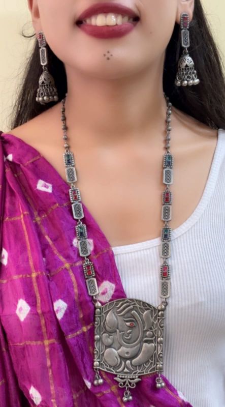 NIPSTec Gorgeous Silver Traditional Afghani Necklace is a beautifully crafted jewelry set designed for women and girls who appreciate intricate detailing and cultural elegance. This stunning long chain necklace features a finely designed Lord Ganpati pendant, symbolizing prosperity and blessings. The pendant and chain are adorned with multi-colored stones, adding vibrant accents to the elegant antique silver finish. Inspired by traditional Afghani craftsmanship, the necklace showcases delicate patterns and detailed work that highlight its ethnic charm. The set is completed with matching dangling earrings, designed to complement the bold and artistic look of the necklace. Perfect for festive occasions, traditional functions, and cultural gatherings, this piece effortlessly adds grace and a statement of heritage to any outfit.
