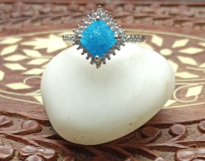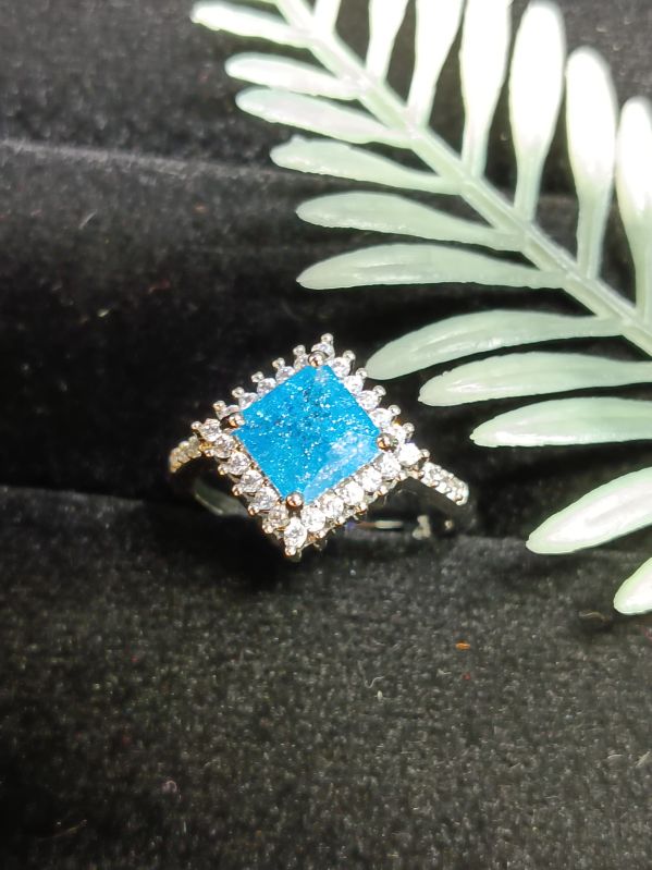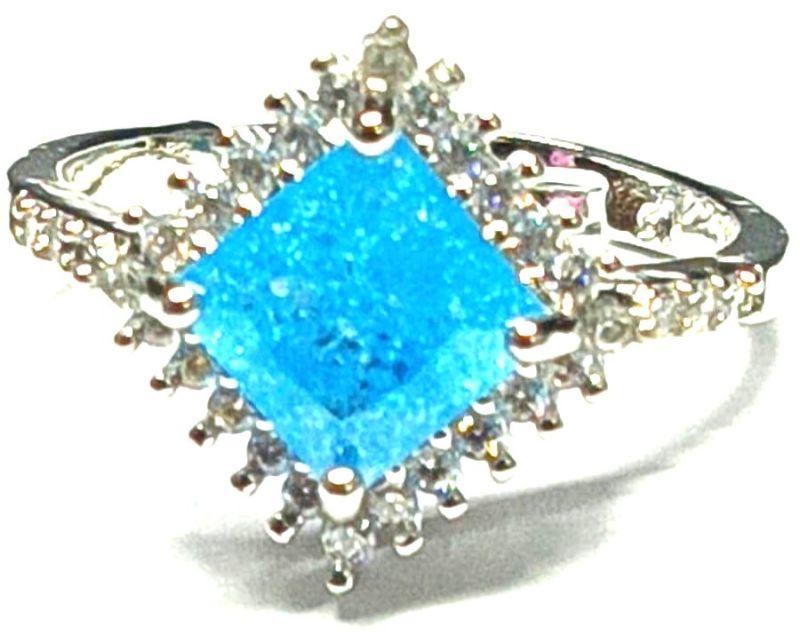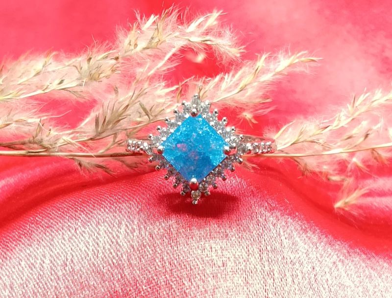 Channel timeless elegance with this sea-blue square-cut cocktail ring, expertly crafted to deliver the look of luxury without the weight of precious stones. At its heart lies a light blue, precision-cut centerpiece, evoking the calm brilliance of tropical waters. A delicate halo of dazzling clear crystals surrounds the central stone, enhancing its radiance and adding depth to the design.